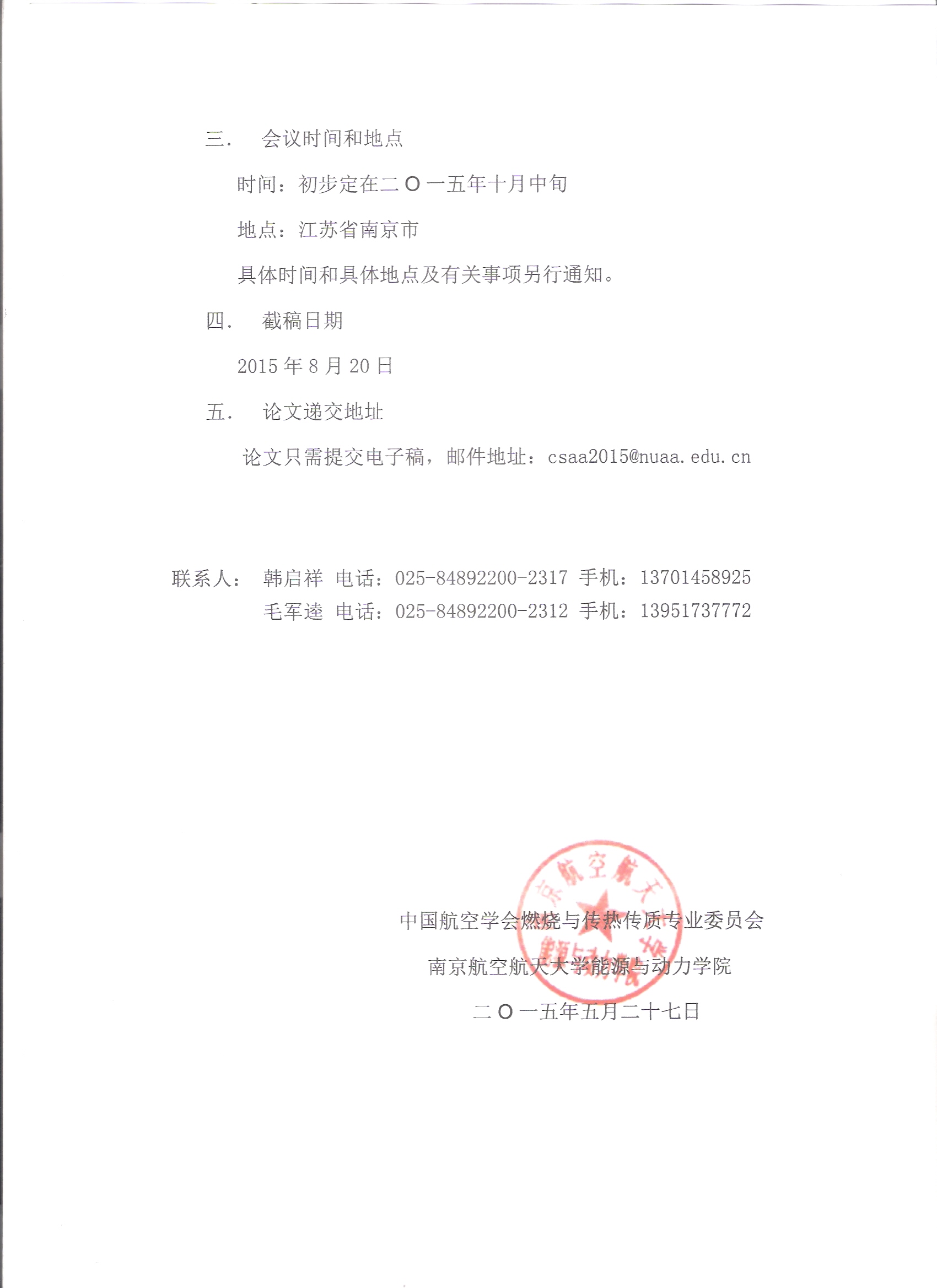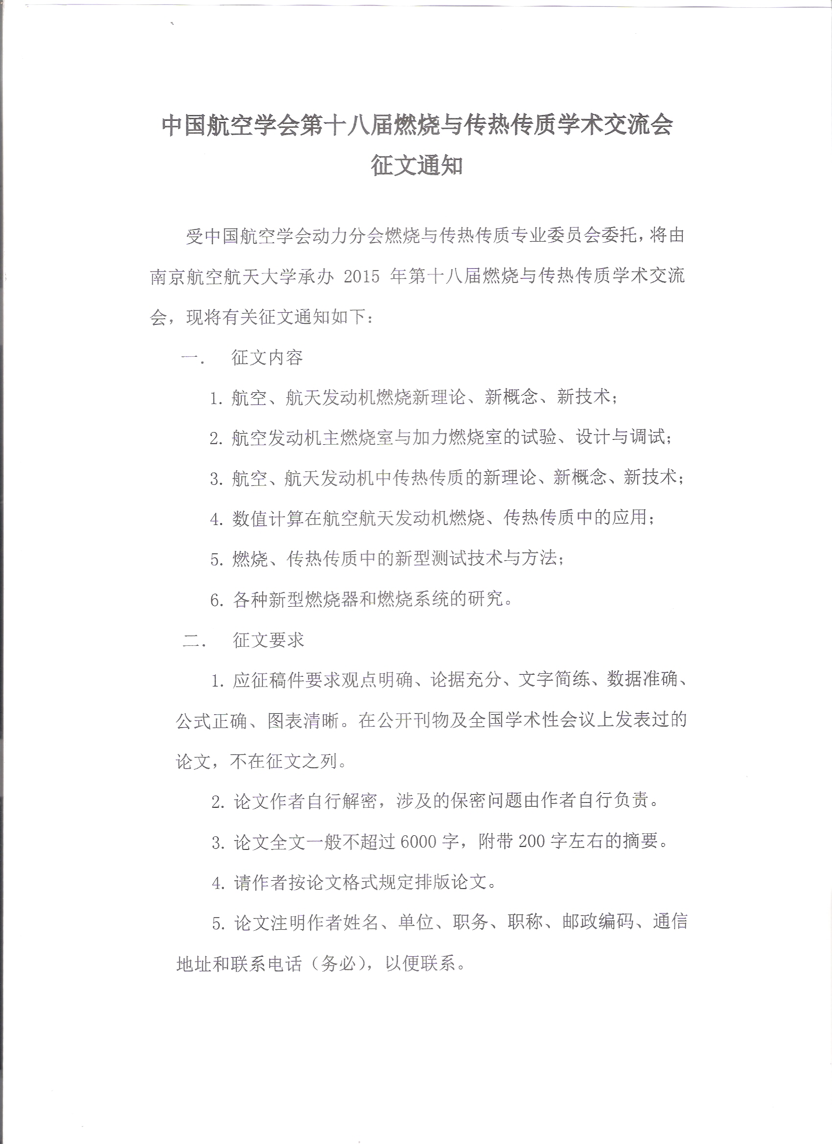 征文通知-----中国航空学会第十八届燃烧与传热传质学术交流会